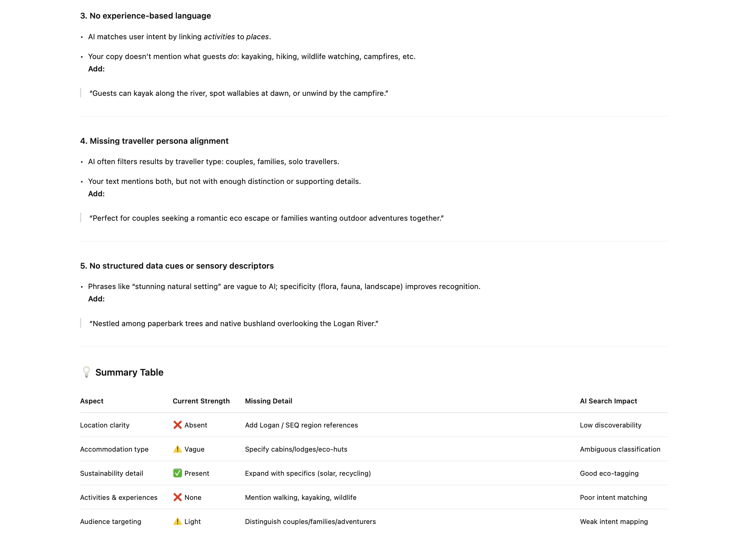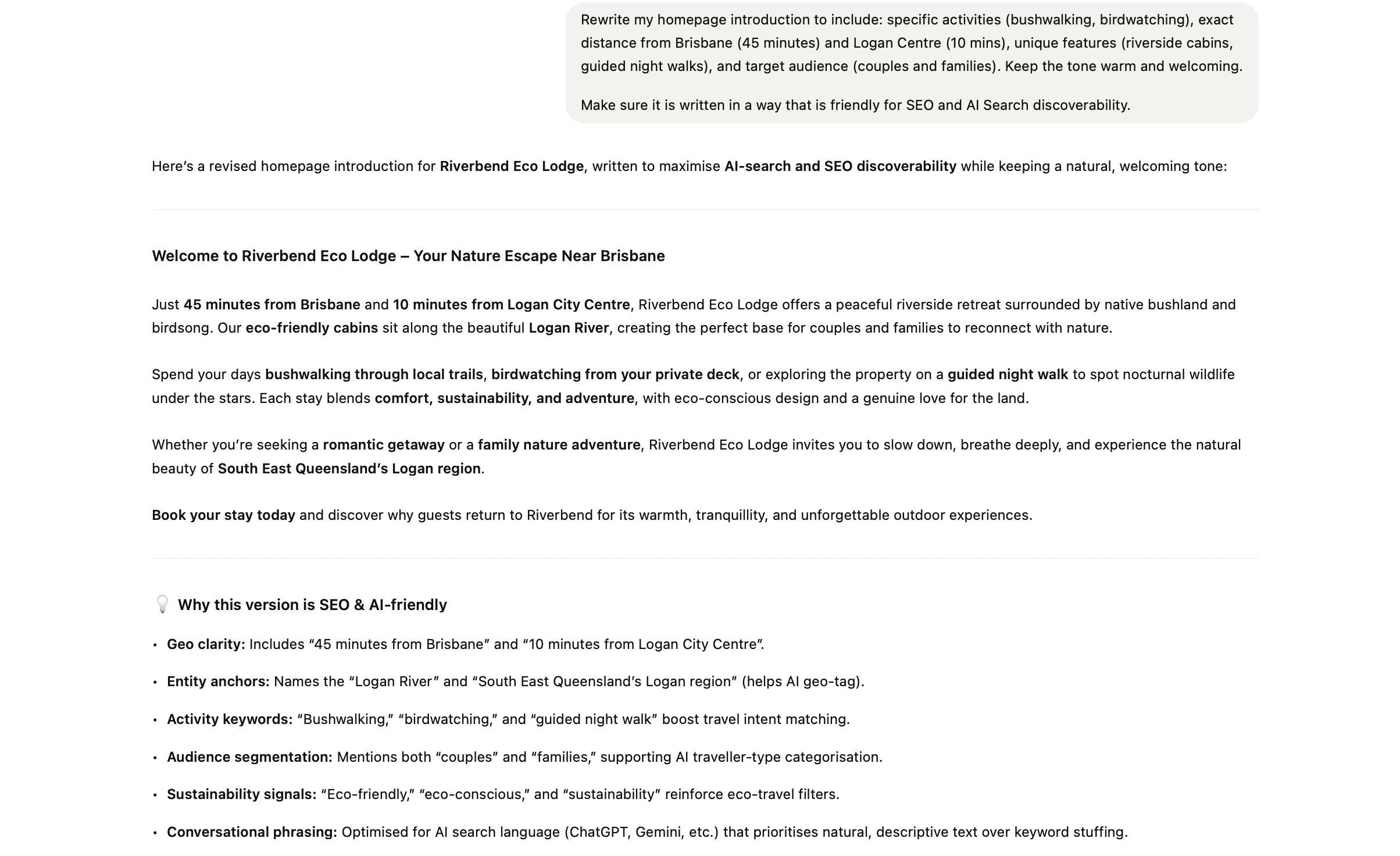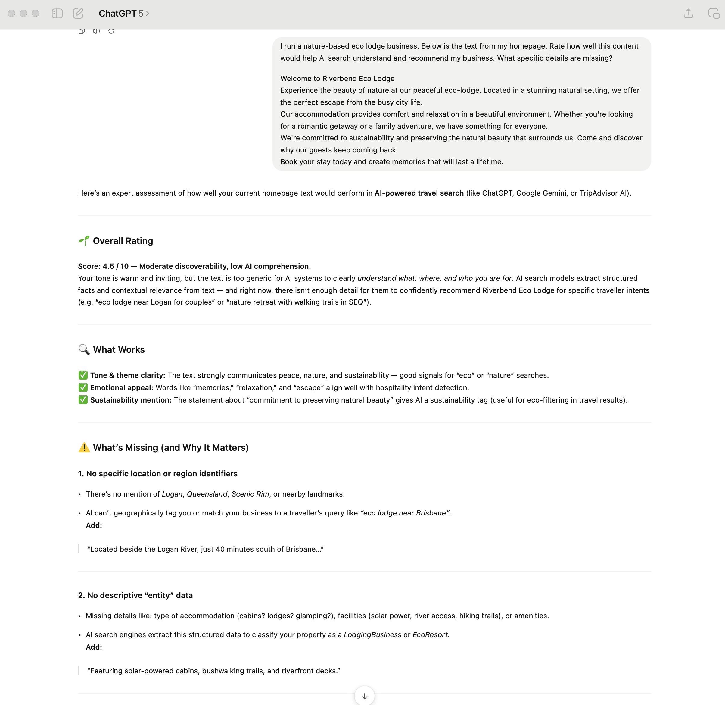 "I run a nature-based eco lodge business. Here's the text from my homepage: [paste content]. Rate how well this content would help AI search understand and recommend my business. What specific details are missing?"