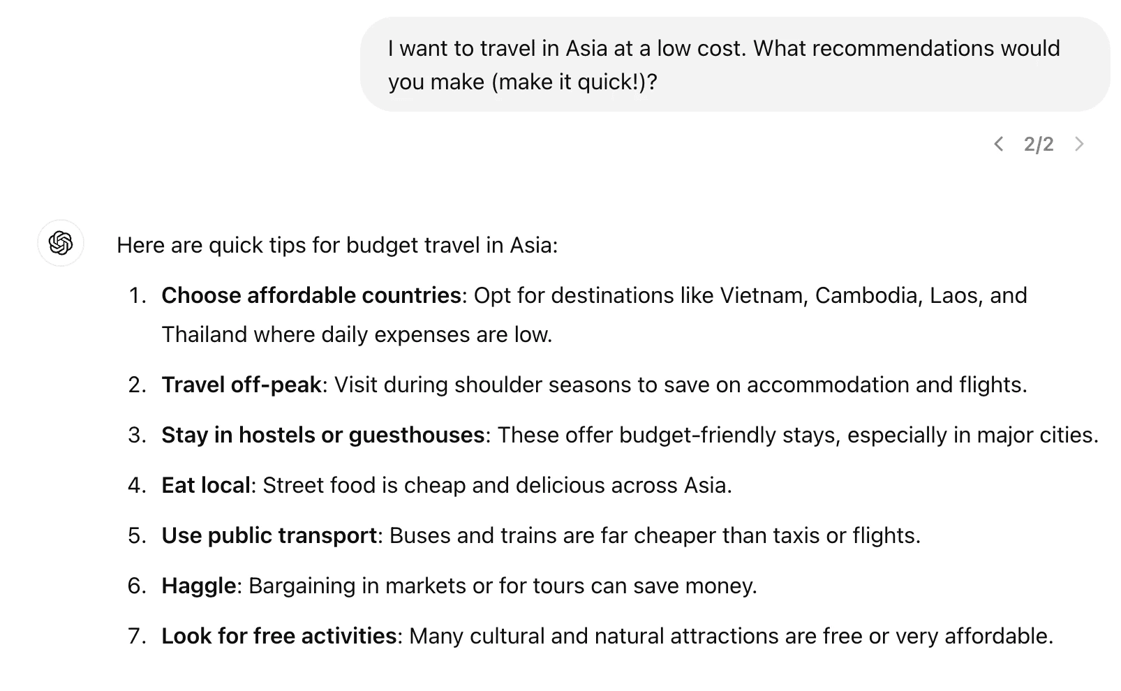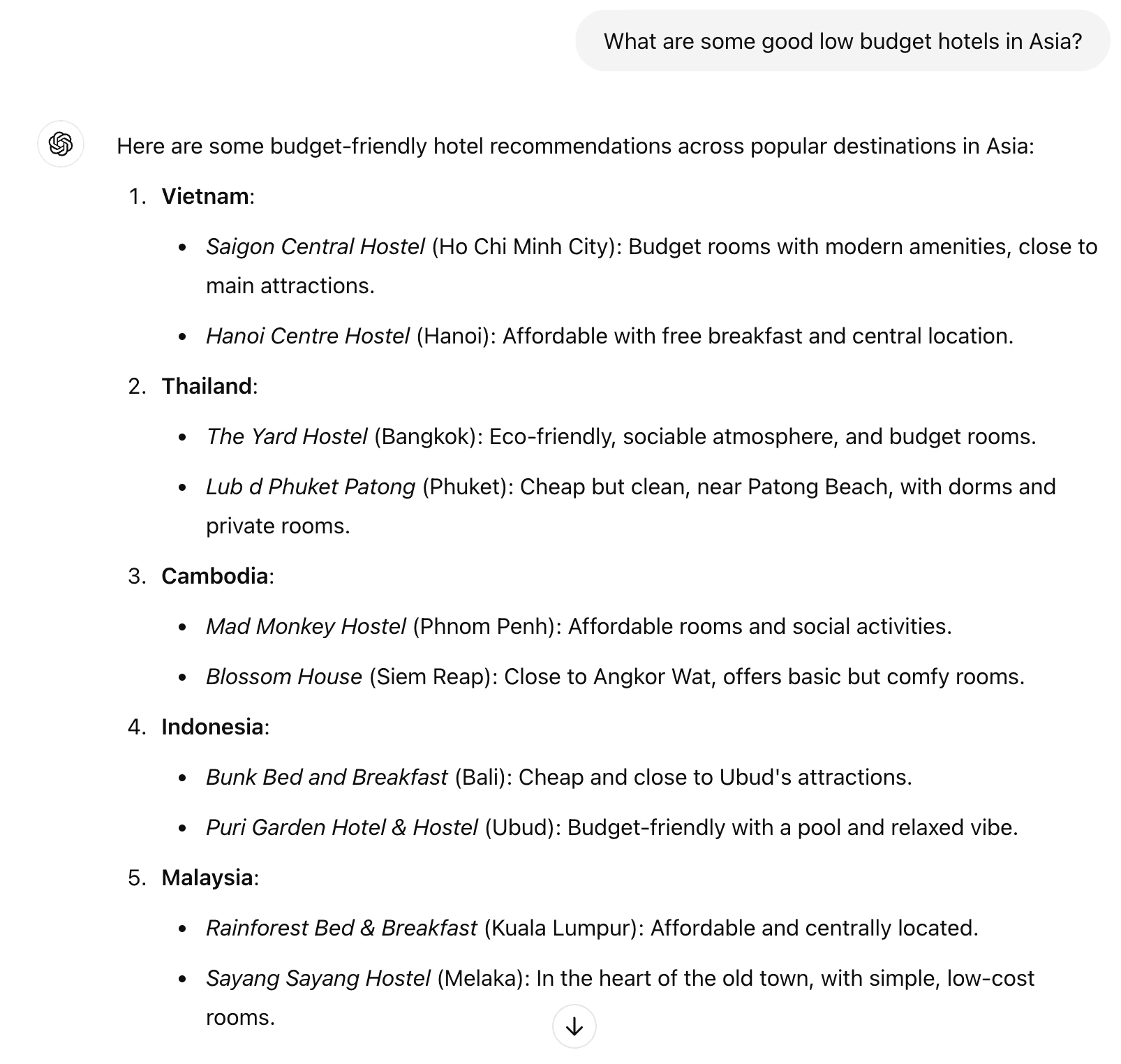 AI Search: Alternatively, ChatGPT is directly recommending options based on my explicit needs (low budget), but is also considering implied criteria - in this case, things that are commonly important for budget travellers (proximity to public transport, hotel quality, amenities, etc.)