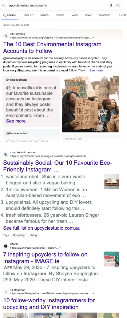 SEO: When using Bing to find upcycle accounts, I’m once again faced with a lot of websites with lists and how-tos - a very common format for SEO optimisation. Content, content, content baby!