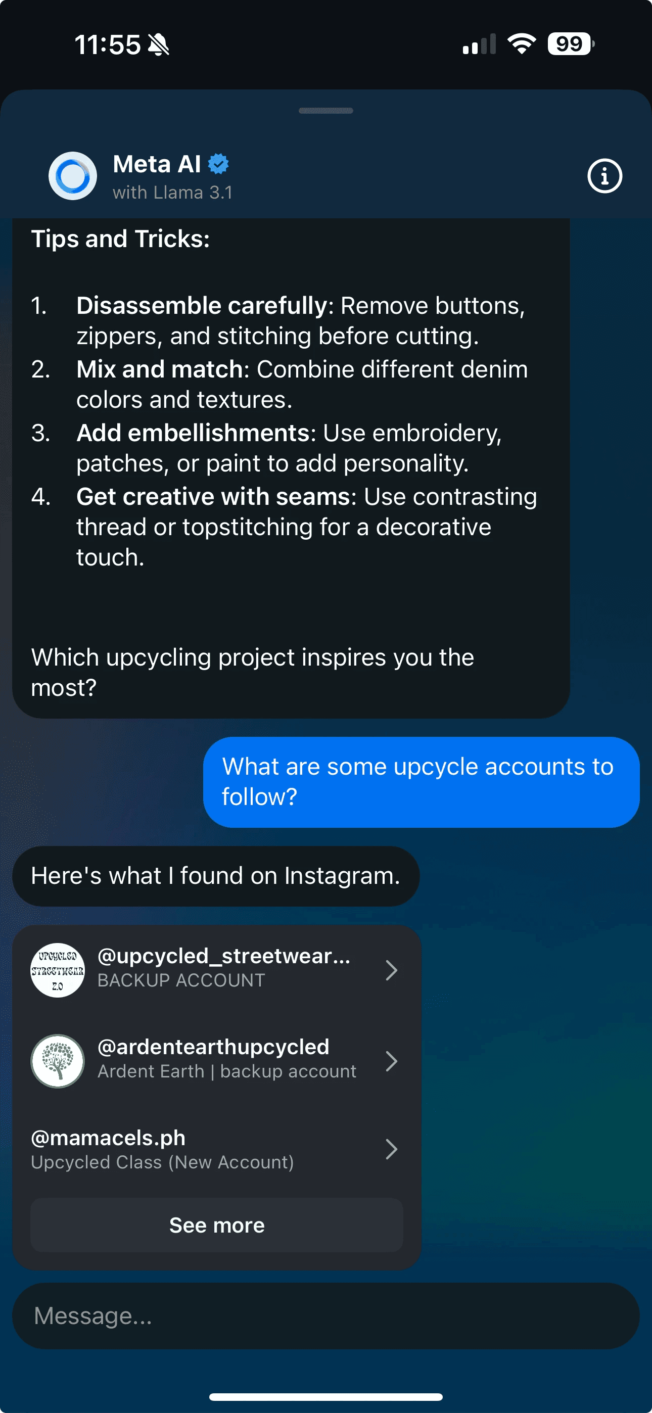 AI Search: I headed over to Instagram and used Meta AI to find some upcycle accounts for inspiration. I was instantly shown accounts with high-quality content and informational videos - all with less than 1000 followers!
